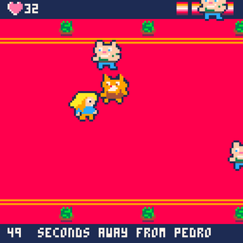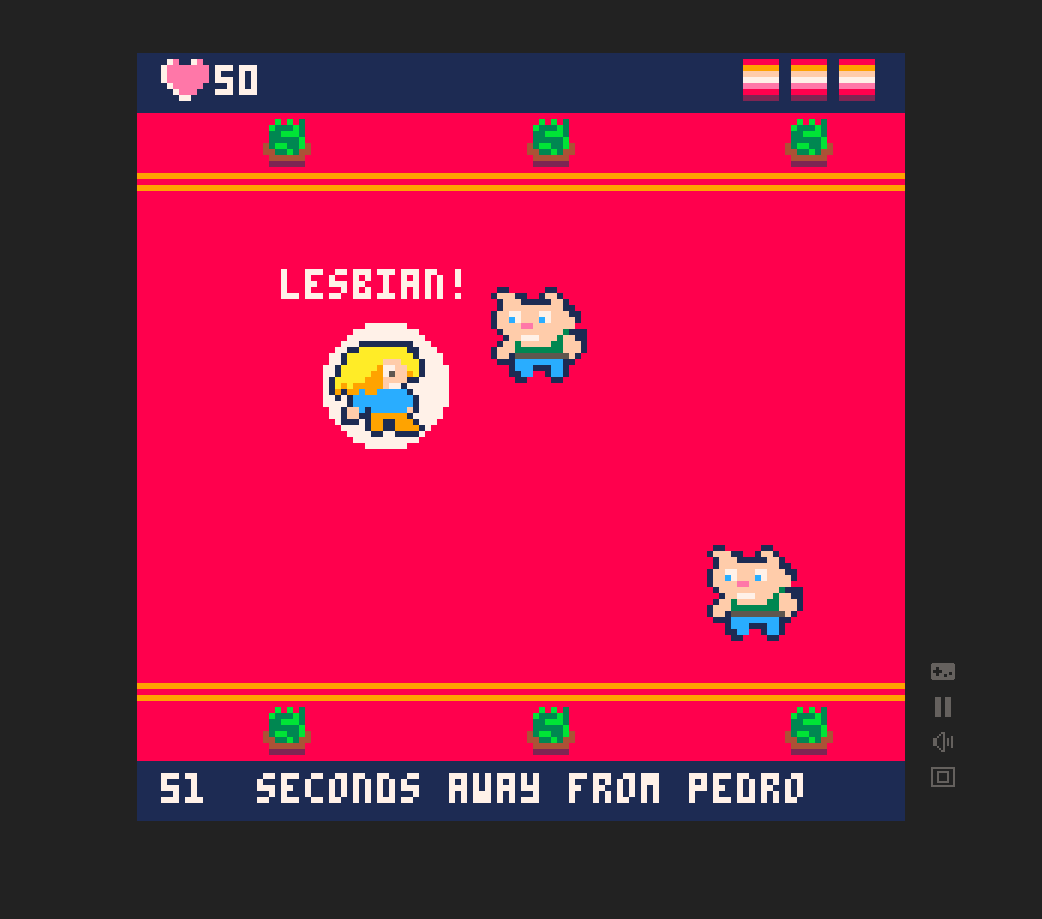 You need to survive on the red carpet for 60 seconds without getting distracted by all the other people who want to date you. Evade their kisses, and get to Pedro! Remember, you can use your lesbian power (press A) to temporary dissuade your suitors.